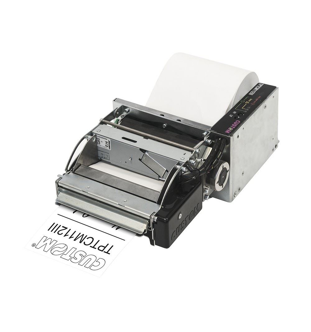 STAMPANTE CUSTOM RICEVUTE/BIGLIETTI 112MM Caratteristiche: - Migliore qualità di stampa a 200dpi - Larghezza carta 112mm - Spessore carta: from 63 to 100 µm - Velocità > di 140mm/sec - Diametro rotolo carta fino a 160mm - Interfacce RS232 e USB - Taglierina altamente affidabile: > di 1.000.000 tagli - Sensori: presenza biglietto, quasi fine carta, black mark e gap etichetta (opzionali)